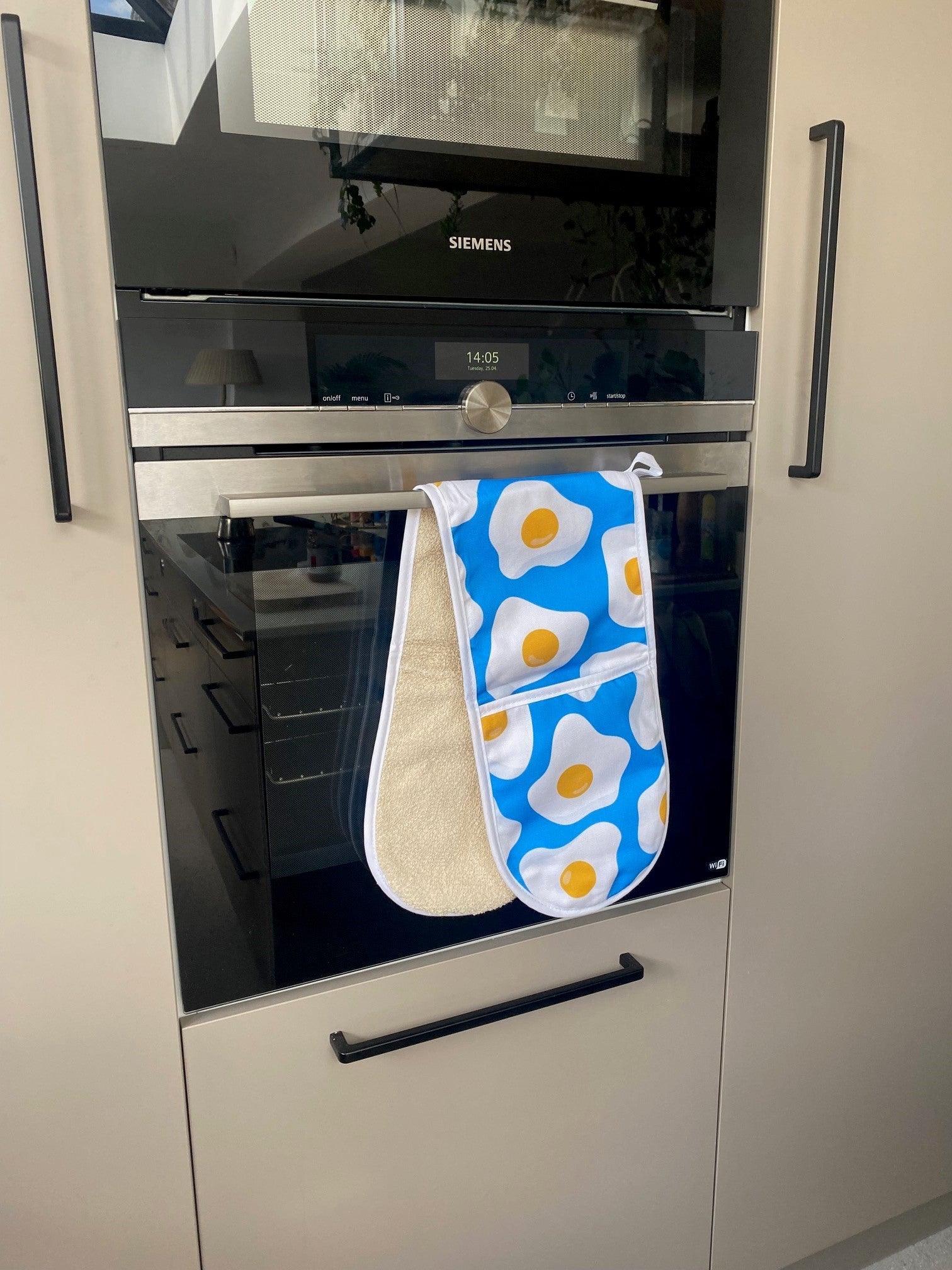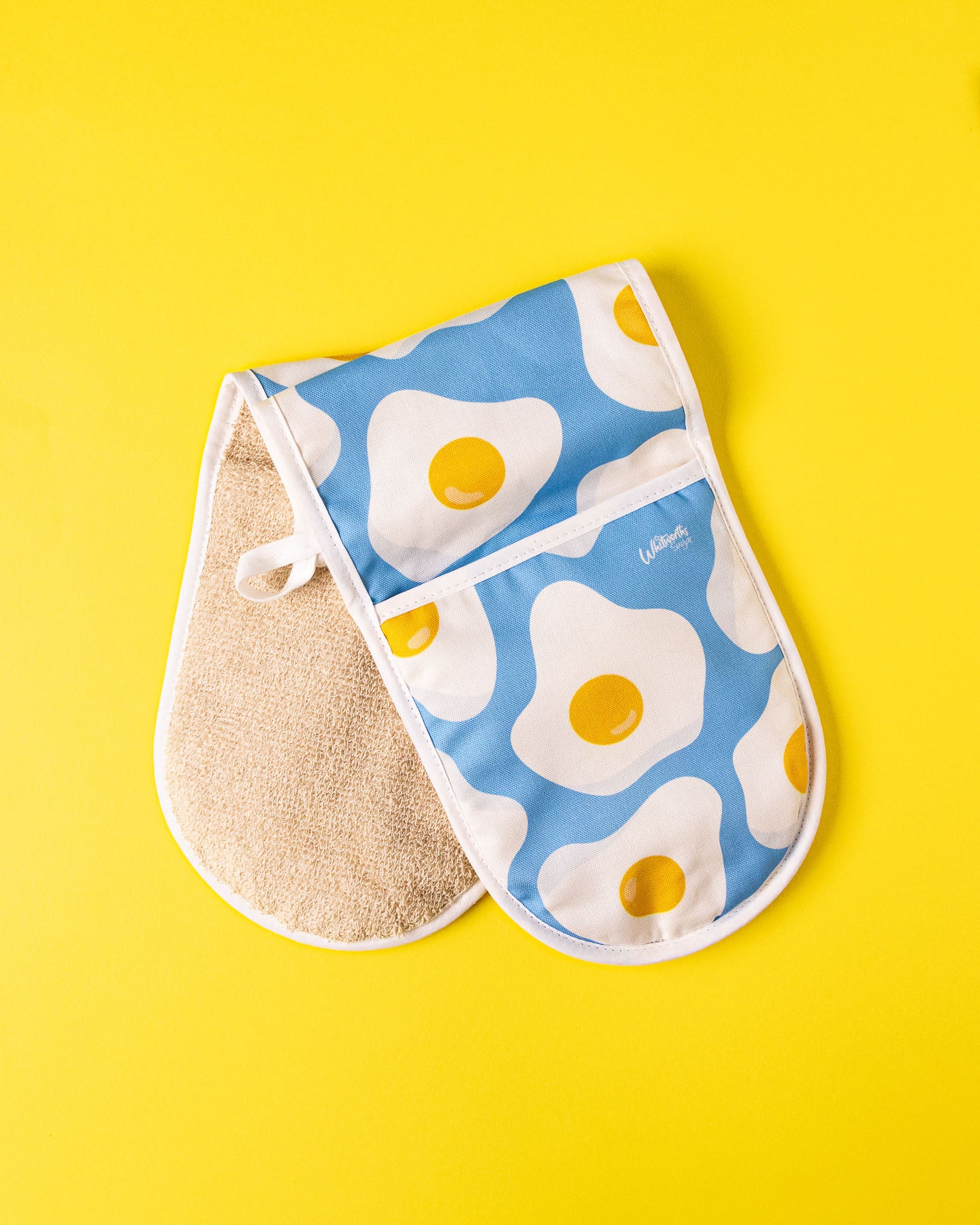 Colourful and fun double oven glove featuring our Sunny Egg design, matching with Sunny Egg tea towel which you can shop right here. It comes with a hanging hoop to hang anywhere you'd like. It is lined with a padded loop material inside the mitts and in the inner section of the oven glove. A perfect addition to your kitchen!